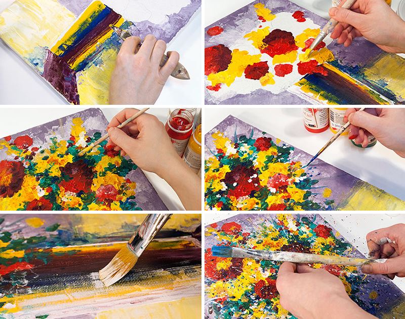 Краска берется на кисть или мастихин с запасом и, ложась на картину, дает объемный рельефный мазок. Особенно выигрышно в такой технике смотрятся цветы, ведь каждый лепесток становится словно живым и его в прямом смысле можно потрогать. Некоторые художники, работая в данной технике, даже не пользуются палитрой, смешивая краски прямо на холсте. Подобное письмо, будь то конкретный объект или нечто абстрактное, может стать хорошим антистрессом.