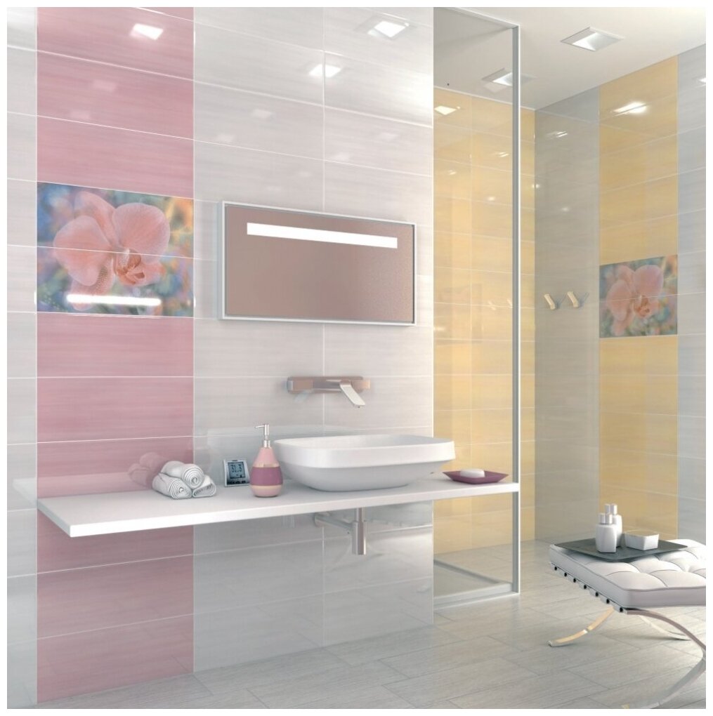 Стеклянный бордюр дополняет картину романтики тремя цветовыми оттенками: розовым, голубым и бежевым, таким образом подчеркивая свежесть раннего утра и легкого блаженства. Словно капли росы под ярким солнцем, орнамент искусно выполняет свою роль изюминки в общей картине интерьера, подчеркивая завершенность дизайнерского замысла.