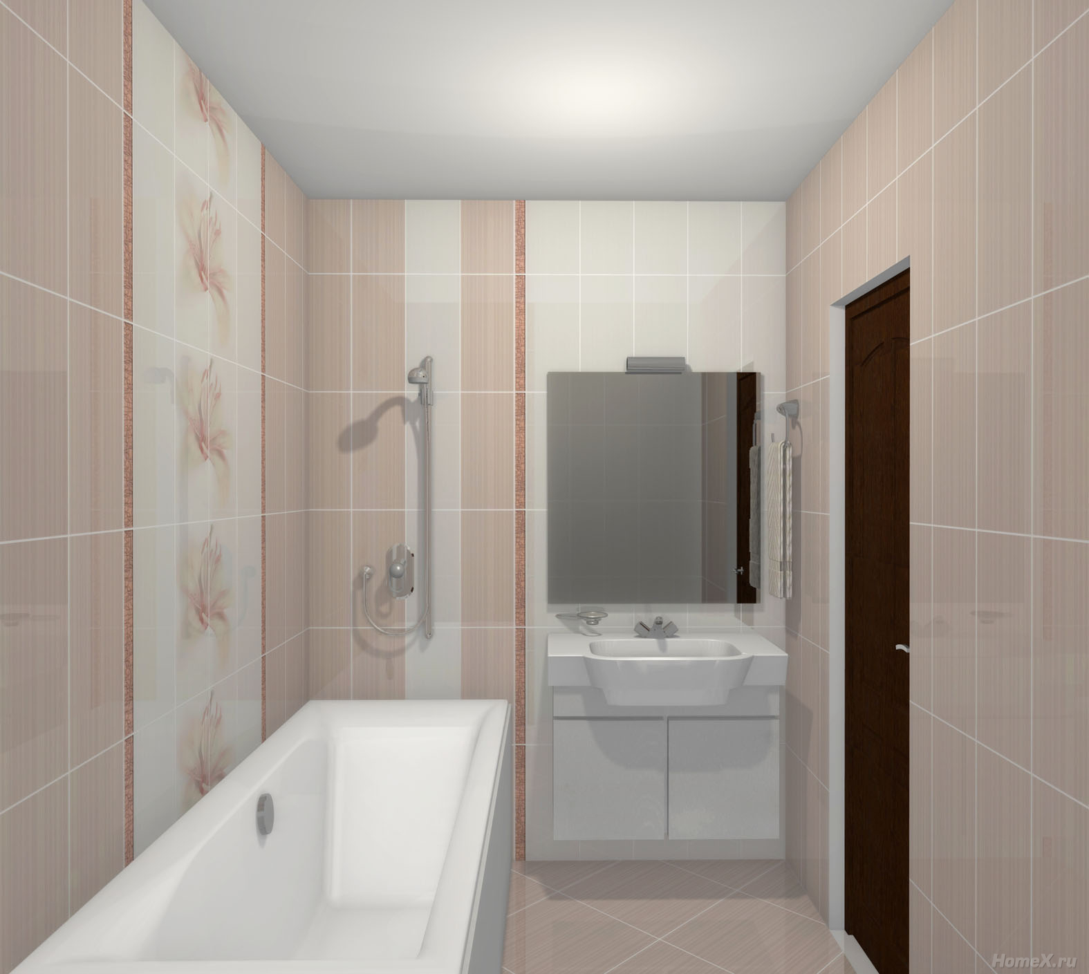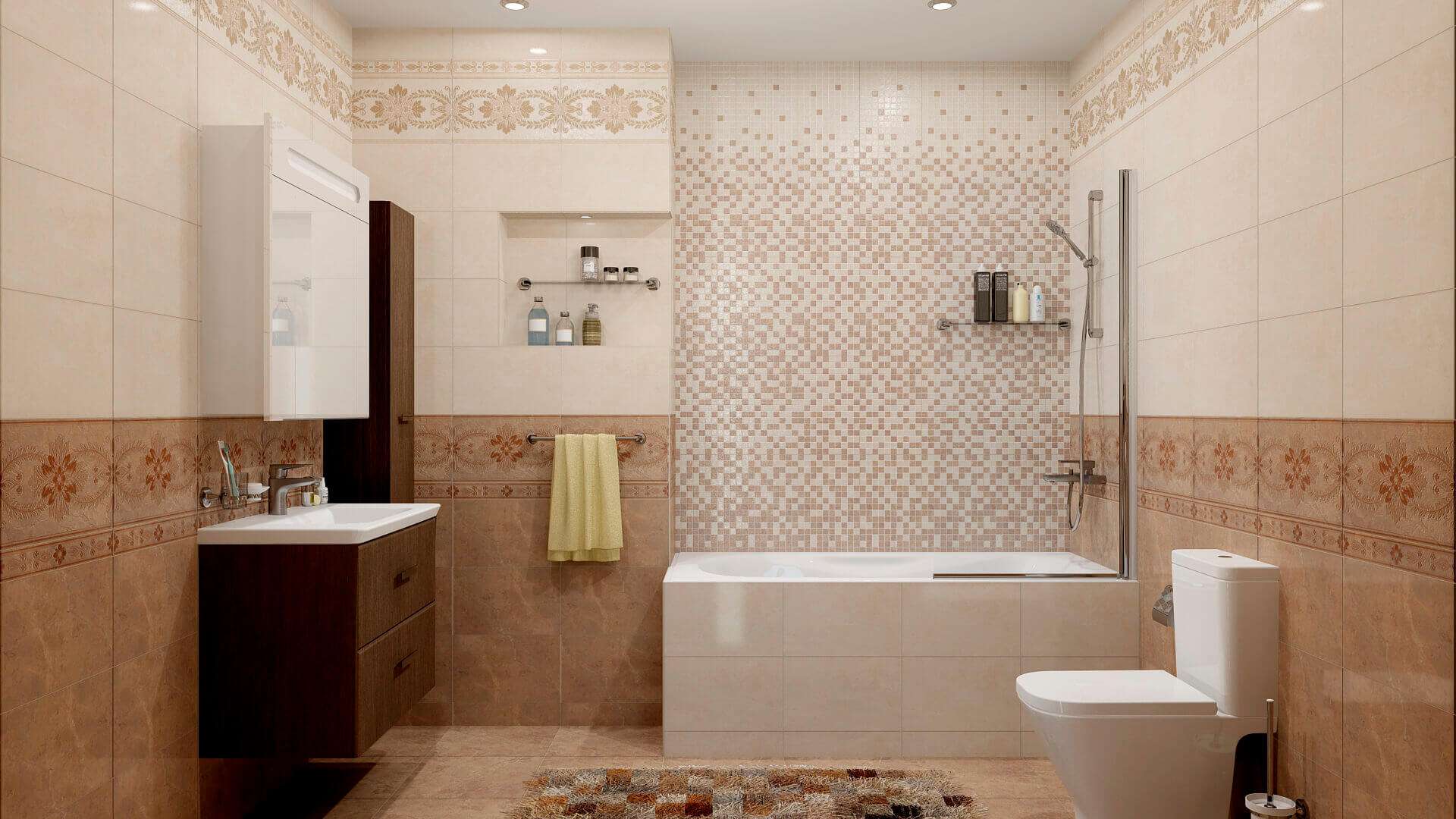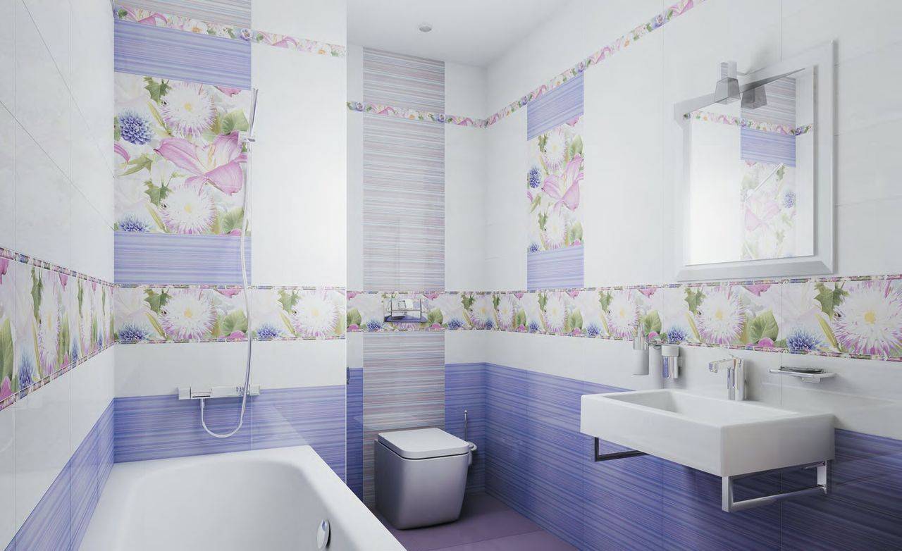 Основные цветовые направления настенной керамики представлены в качестве нескольких цветовых оттенках: молочном, бежевым, розовым и голубым, что великолепно сочетается с фоном напольного кафеля, который выполнен в пастельных тонах.