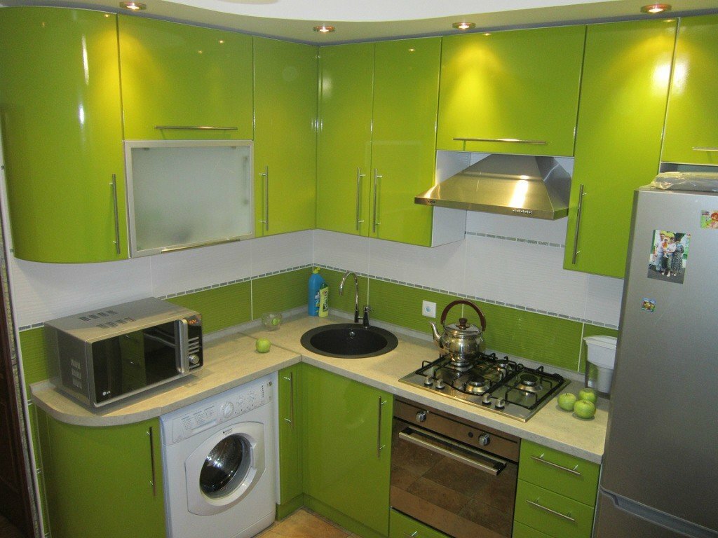 От стиральной машины на кухне лучше отказаться. Поставьте ее в санузле или в коридоре. Отдайте предпочтение машинкам с вертикальной загрузкой, открывающиеся сверху дверцы сэкономят место.