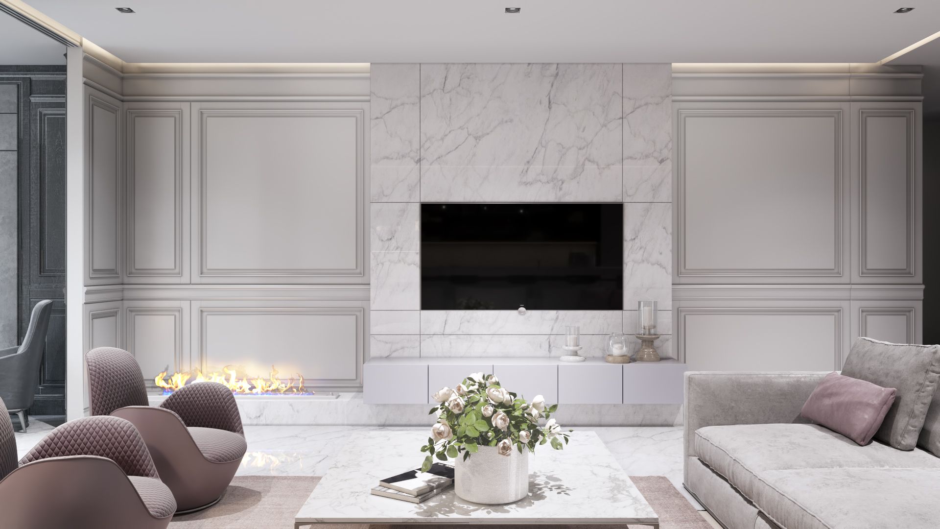 - Камин. Под телевизором размещается декоративный камин, который можно для большего уюта украсить дополнительной подсветкой. Камин может также выполнять функцию комода под ТВ.
