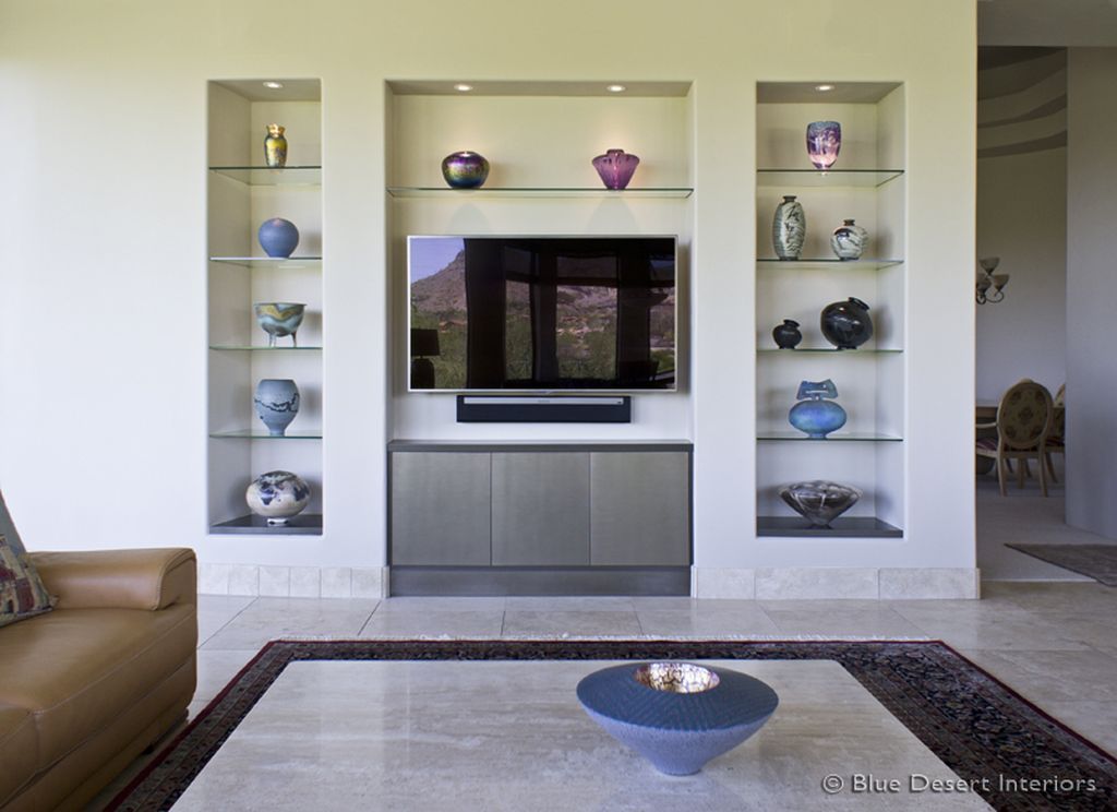 Можно самому определить размер, количество отсеков, цвет и форму, связав таким способом воедино все элементы интерьера. Внутри без труда можно спрятать провода, а дополнительная подсветка расставит нужные акценты.