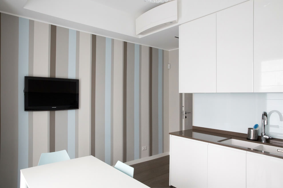 Горизонтальные полосатые обои в интерьере белой кухни.