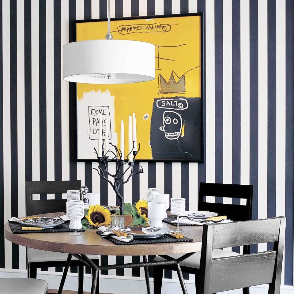 Контрастные и широкие полоски выглядят элегантно и изыскано. При этом их ширина обратно пропорционально влияет на визуальное восприятие пространства. То есть, чем они шире, тем сжатее смотрится комната.