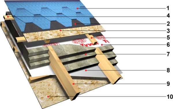 Такой кровельный пирог должен быть над жилой мансардой- Если решено превратить в жилую мансарду неотапливаемый чердак (как обустроить чердак можете узнать из статьи на нашем сайте), начинать обустройство придётся с утепления кровли, так как она была выполнена без утепления, как на фото снизу. Утеплять придётся со стороны помещений, по той же схеме, что приводится выше.