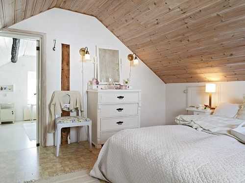 Если же в доме не нашлось места для расположения кровати для взрослых, то чердак станет лучшим вариантом. Для этого после проведения подготовительных работ, в комнате нужно установить кровать, шкаф для одежды, большое зеркало с косметическим столиком и пуф. Стены можно оклеить обоями светлых тонов с нежным рисунком, а мебель приобрести белого цвета, украсив дополнительно дверцы шкафа цветочным орнаментом. Для создания более душевной, интимной обстановки можно использовать торшер с узором и ковер кофейного оттенка. Такой дизайн, как мы видим на фото, придется по душе любителям французского стиля.
