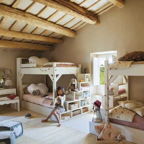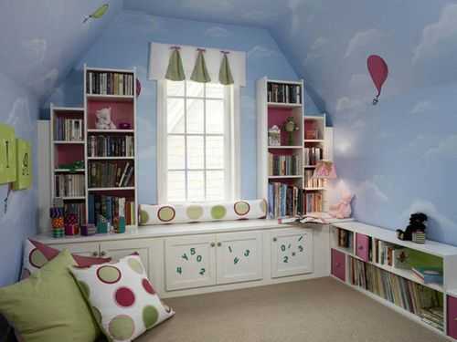 Если загородный дом не отличается большой площадью, а его обитатели планируют проводить в нем много времени, да еще и с детками, то лучшим выходом для предоставления малышам личного пространства, будет создание детской на чердаке. В данном случае, необходимо приобрести безопасную мебель, без острых углов, которую можно надежно укрепить и избежать случайного падения шкафов на детей. Для создания привлекательного дизайна в интерьере нужно использовать светлые, радостные краски. Это могут быть: нежно-зеленые, светло-голубые, розовые, белые, кофейные, сливочные оттенки.