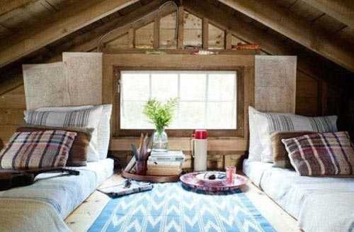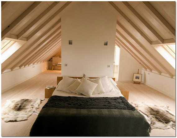 Спальня. Создавая дизайн спальни на чердаке надо не забывать о наличии балок, главное, чтобы по центру комнаты высота их расположения превышала человеческий рост. Под скатами по краям помещения можно поставить односпальные кровати, а вот двуспальный вариант расположить по центру, при этом в более низкой части чердака разместить предметы мебели для хранения вещей (подробнее: «Дизайн спальни на мансарде, советы и оформление»).