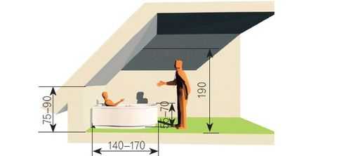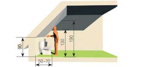 Унитаз или биде, как правило имеют высоту, 40 см и глубину от50-70 см. Высота обычно не превышает 90 см, что также означает, минимальную высоту наклонной стены. Взрослым, которые используют эти устройства, чтобы не ударился головой, нужно по крайней мере 130 см, когда сидят (измеряется на расстоянии 20-30 см от стены) и 190 см, когда стоят около биде или унитаза. Если вы хотите, наилучшим образом использовать пространство под наклоном (как в описанных выше предположениях), угол уклона крыши должен быть 55-63 °. Конечно, этот угол может быть меньше, если наклонная стенка будет выше или устройства будут от нее отодвинуты.