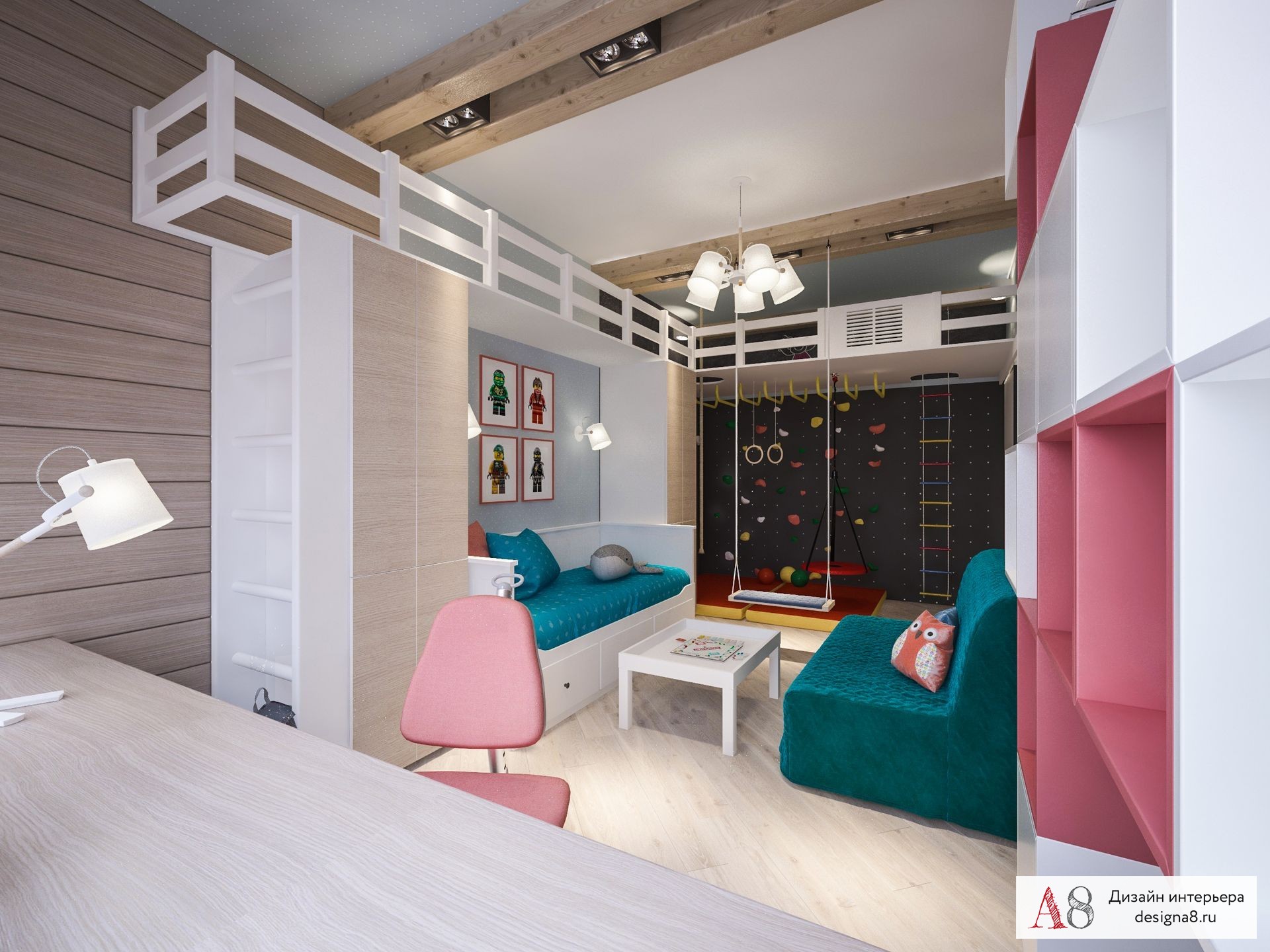 На самом подиуме может быть зона отдыха, рабочее место или манеж, но спальное место днем будет надежно скрыто внутри конструкции.