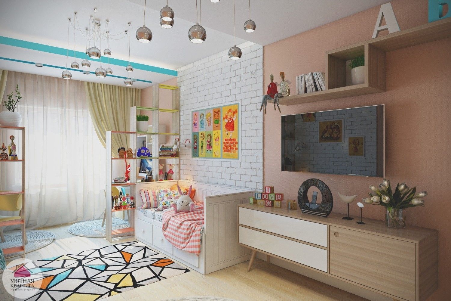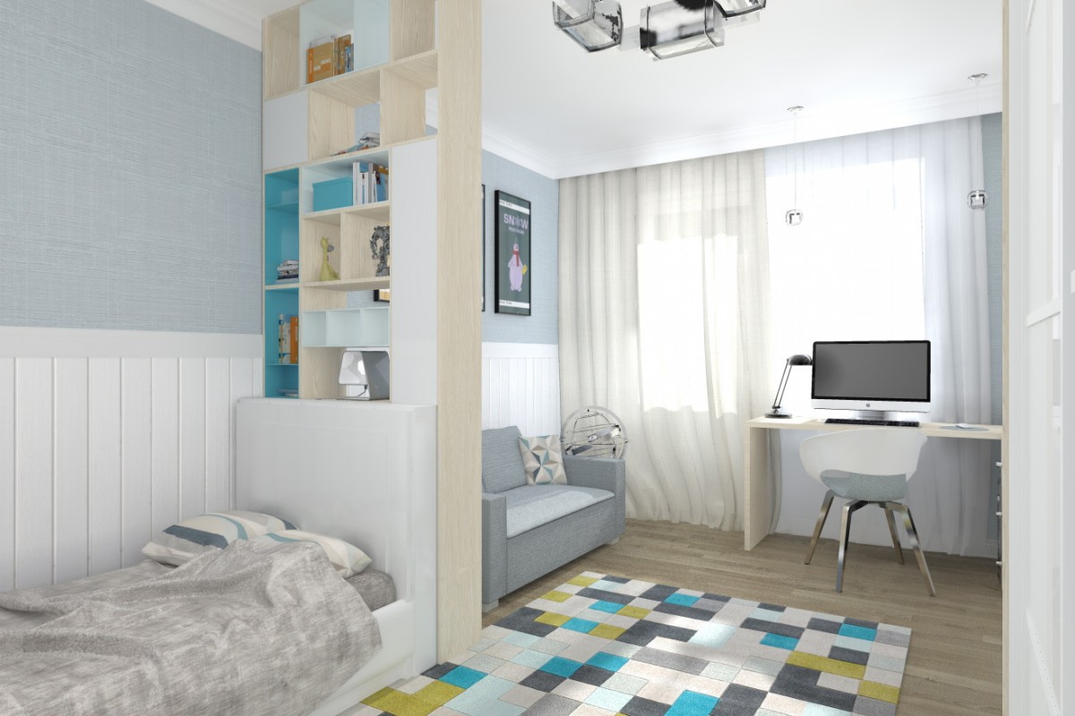 В данной ситуации, решила дизайнер Юлия Кирпичева, самым лучшим выходом будет правильное зонирование. Чтобы разделить одно помещение на родительскую и детскую половины, потребуется небольшой ремонт однокомнатной квартиры — между двумя самостоятельными зонами появится раздвижная радиусная перегородка.
