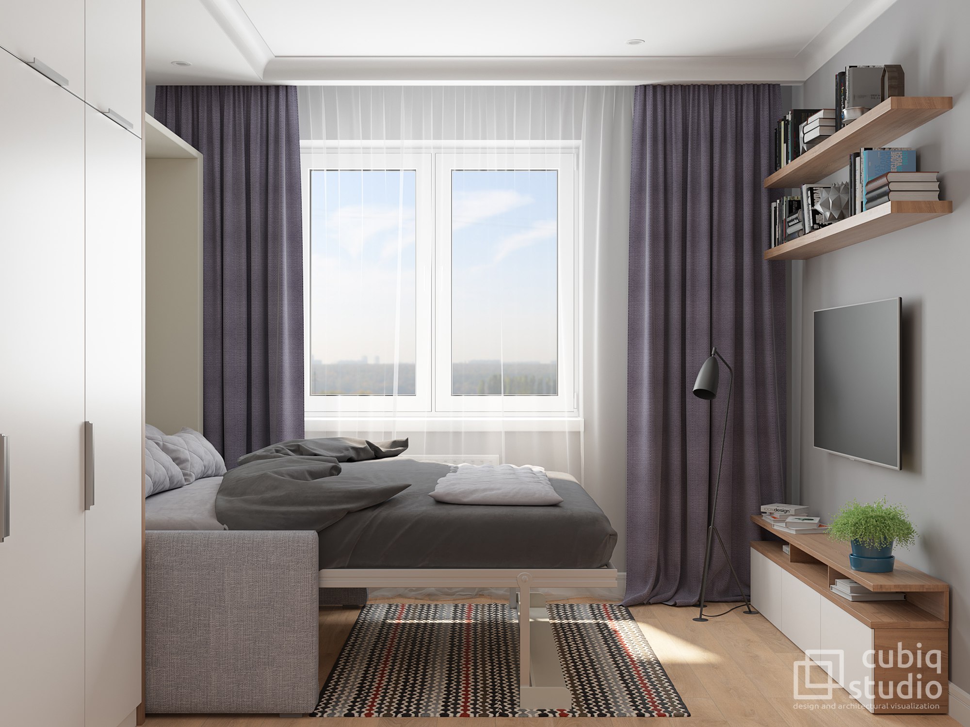 Последний вариант наиболее удобен для однокомнатных квартир, ведь вы точно найдете место для дивана для просмотра телевизора или приема гостей, но не всегда для двуспальной кровати или спального места для гостей.