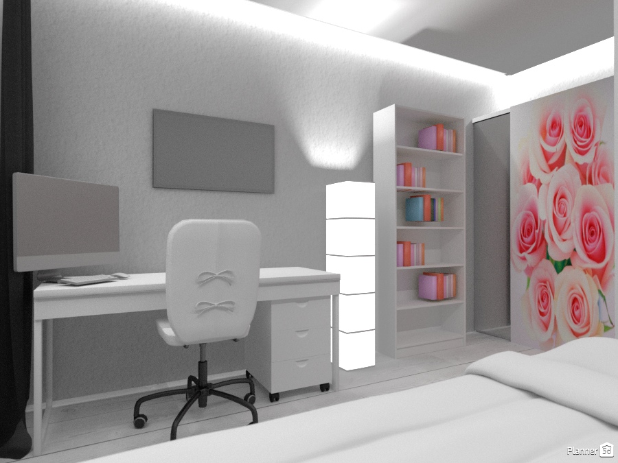 И, конечно же, мебель: шкафы и стеллажи, кровати и столы со стульями. Возможно, книжные полки, кресла, компьютерный стол и, конечно, люстру или другой светильник. Ваша комната может выглядеть так, как показано на рисунке