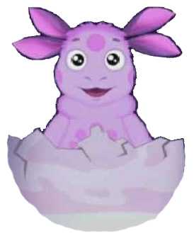 Лунтика вырезаем по трафарету из вареной колбасы, пятнышки на лбу и животе из копченой колбасы или сыра, глаза — белок яйца и кружочки маслин, рот — красный перец. Скорлупа из белка яйца.
