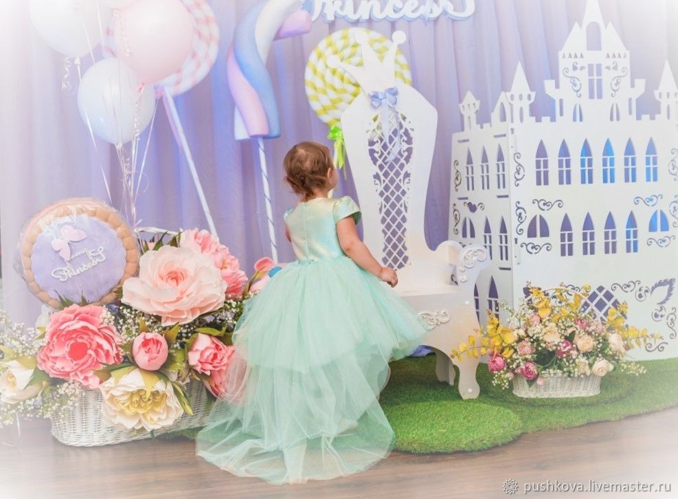 На противоложной стене создайте фотозону для детишек. Сделать это можно так: обустройте сцену, на заднем фоне которой можно поместить замок из картона розового цвета, дополните сцену красными, белыми и розовыми шариками. - Стулья можно перевоплотить в некое подобие трона. Для этого украсьте каждый стульчик нежной тканью со складками, лентами и бантиками. Стоит обратить внимание и на праздничный стол: можно накрыть обеденное место нарядной скатертью, украшенной цветами и канделябрами, также следует выбрать посуду в сказочном стиле. Это могут быть тарелочки с изображением принцесс и принцев. Стаканчики с розовыми трубочками также могут дополнить образ сказки.