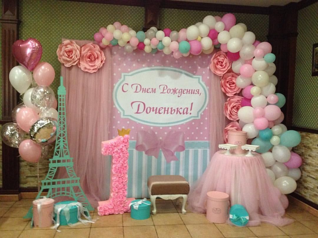 Ребенок в 2–3 года порадуется, если для его праздника родители оформят фотозону воздушными шариками и большими буквами. Цветовую гамму для такого праздника лучше всего подбирать светлую. Красиво будет смотреться фотозона, оформленная в голубом, бежевом, розовом или зеленом цвете.
