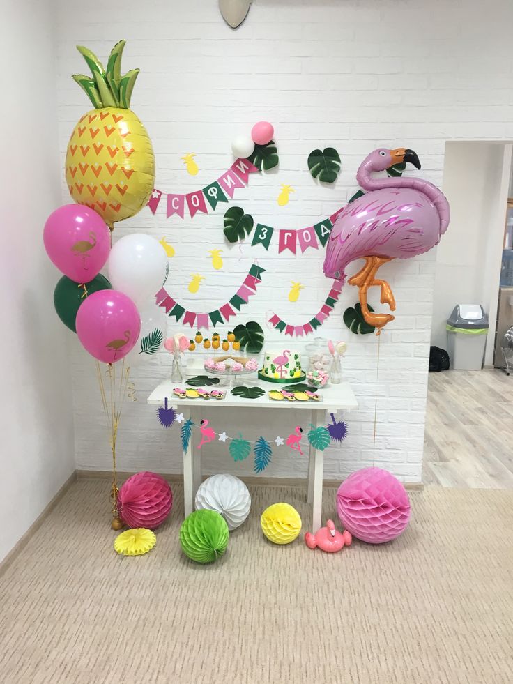 Проемы дверей и фотозону оформите декоративным дождиком — это придаст помещению нарядный вид. Среди прочих украшений можно поставить большой картонный логотип «Малышариков» с именем сына вместо названия программы, мягкую игрушку или плакат-цифру с возрастом ребенка.
