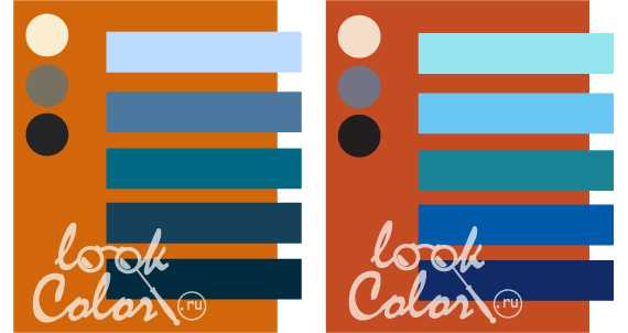 Оранжево-коричневый сочетается с синим: нежно-голубым, джинсовым, морской волной, темным сине-зеленым, грозовым. Контрастные пары составят средний кремовый, серо-оливковый, черно-серый.