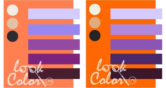 Оранжевый сочетается с фиолетовым: голубо-фиолетовым, чертополоховым, аметистовым, красно-фиолетовым, баклажановым. Оттенки для контраста: ванильный лед, светлый, оранжево-бежевый, черно-серый.