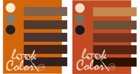 Оранжево-коричневый сочетается с коричневым: кофеем с молоком, молочным шоколадом, сепией, шоколадным, горьким шоколадом. Нейтральная палитра: средний кремовый, серое дерево, черно-серый.
