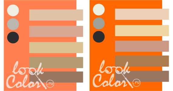 Оранжевый сочетается с бежевым: светло-персиково-бежевым, светло-желто-бежевым, средне-розово-бежевым, темным оранжево-бежевым, темным коричнево-бежевым. Оттенить композицию можно ванильным льдом, зеленовато-серым, мокрым асфальтом.