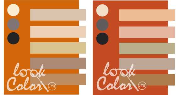Оранжево-коричневый сочетается с красным: китайским красным, кармином, вишневым, винным, темно-бордовым. Оттеняющая гамма: средний кремовый, светлый персиково-бежевый, мокрый асфальт.