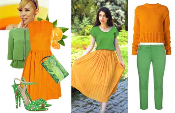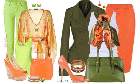 Для любителей эпатажа подойдет сочетание оранжевого и зеленого, которое создает очень необычную комбинацию. В настоящее время этот цветовой ансамбль является одним из самых модных. В данном случае с оранжевым цветом сочетаются любые оттенки зеленого. В границах палитры при условии использования небольшого количества оранжевого допустимо применение нескольких оттенков зеленого. Например, комплект из блузки травянистого оттенка зеленого цвета, изумрудно-зеленых брюк (или модные юбки), оранжевой обуви, сумки и других аксессуаров. А если у обладательницы подобного наряда еще и рыжие волосы, то успех гарантирован.