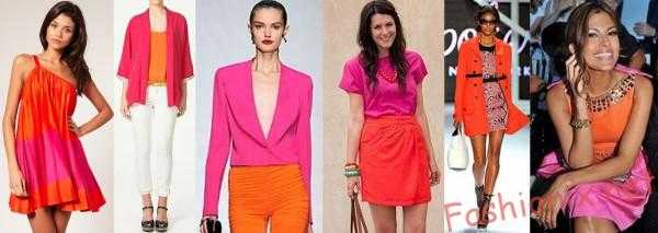Сочетание оранжевого с розовым до настоящего времени не являлось достойным применения. Однако если оттенки обоих цветов подобраны идеально (мягкие или яркие), такая комбинация вполне заслуживает внимания. В этом случае важно помнить о том, что один оттенок не должен доминировать над другим, перекрывая последний. В одежде оранжевого цвета можно использовать элементы украшений розового оттенка, и наоборот. Но акцент остается на основных цветах гардероба. При условии удачного комбинирования оттенков розового и оранжевого ансамбль будет вполне приемлемым для представительниц прекрасного пола в любом возрасте.