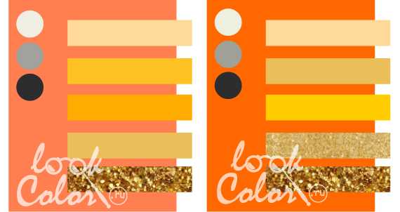 Светло-оранжевый сочетается с желтым: абрикосово-желтым, кукурузным, желто-оранжевым, соломенным, ярким золотом. Базовая палитра: белый шепот, серебряный, мокрый асфальт.