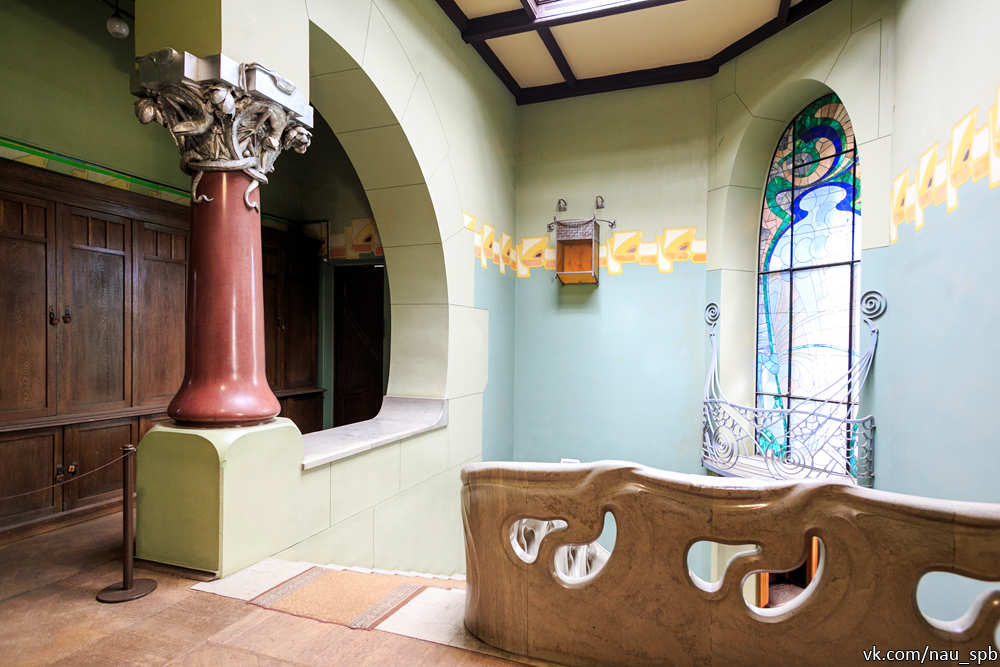 Парадный вход со стороны Малой Никитской улицы.Модель дверной ручки — остроумная и гениальная находка. Дело в том, что на тот момент еще не было изобретено небьющееся стекло, и эта ручка прекрасно его защищает. Стекло 1902 года до сих пор не разбивалось и не менялось. Вместо гигантских шкафов стояли витражные ширмы — крылья стрекозы, переходящие в кронштейны для светильников. Это было сказочное, необычное пространство, похожее на театральные декорации.