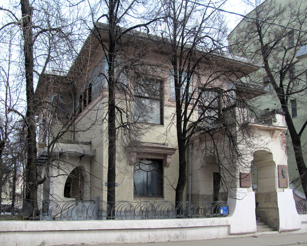 П.Рябушинского. С 1919 г. в здании размещалось государственное издательство (Госиздат), с 1925 по 1931 — Всесоюзное Общество культурных связей с заграницей. С 1931 по 1936 гг. здесь жил Горький. В 1965 г. был открыт мемориальный музей-квартира Горького. Архитектура: Кубический объем двухэтажного здания подчеркнут горизонталями сильно вынесенных плит карниза, асимметричными выступами стен, массивными крыльцами и балконами. Все фасады здания разные и неповторимые. Геометрически простые объемы сооружения перекрыты плоской крышей, над которой возвышается шатер стеклянного светового фонаря, расположенного над центральным холлом. Расположение объемов следует логике «органического» роста здания. Асимметричная композиция; на красную линию улицы выходит массивное крыльцо; фасады отступают от краной линии улицы, особняк обнесен невысокой решетчатой оградой; главный фасад обращен к церкви Вознесения (на север). Рамы окон все разные. Планировка свободная. Помещения группируются вокруг внутренней лестницы, выполненной в виде живой формы воды.