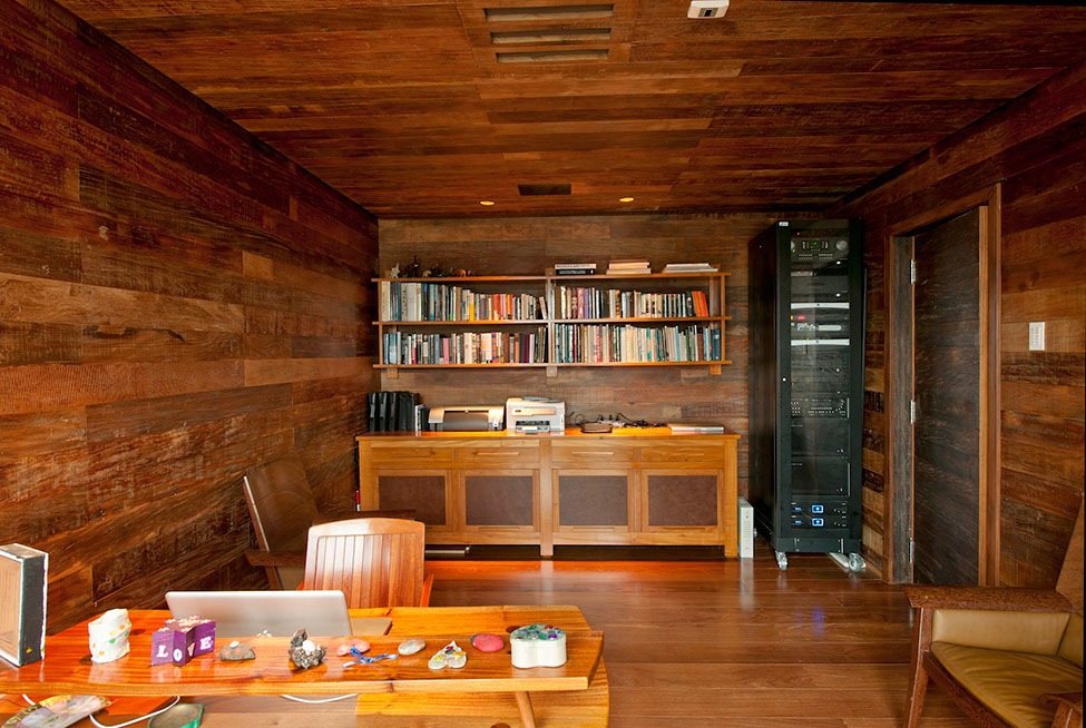 Основой ламината является древесноволокнистая плита, а его декоративный слой может содержать натуральный шпон, однако называть ламинат деревянной отделкой стен — значит немного преувеличивать. Но, как и в случае с полом, ламинат на стенах — доступная и популярная замена паркета.