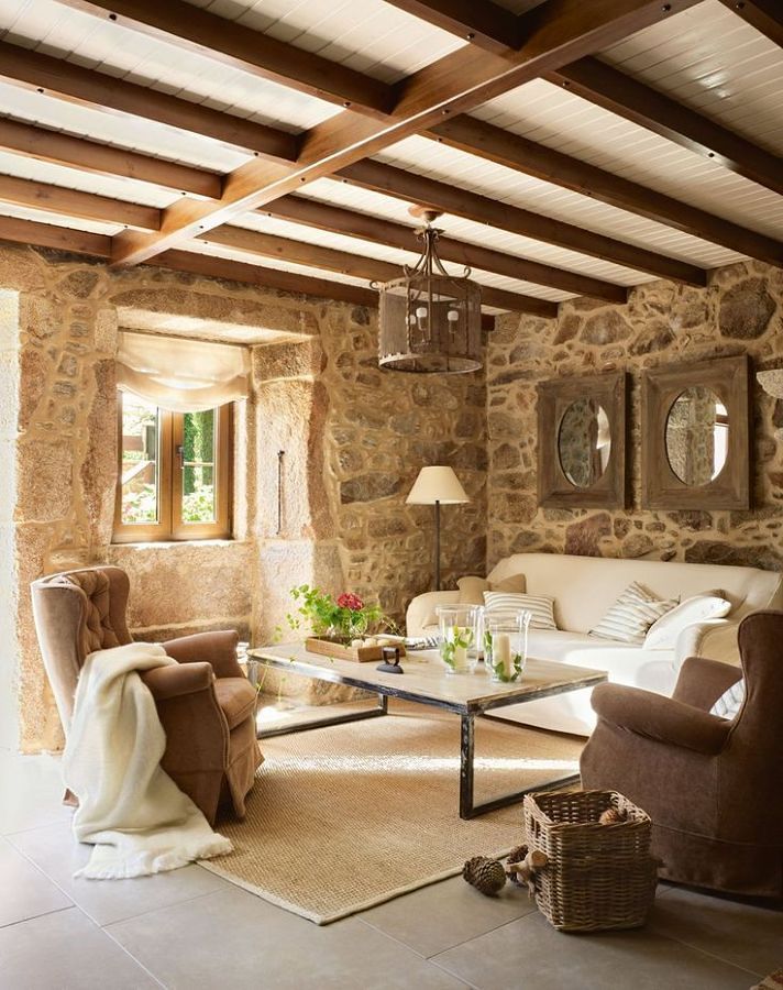 Для декоративной отделки стен в интерьерах с сельским колоритом часто используется обрезная доска с естественной шершавой фактурой. Так называют цельное полотно бревна, обработанное по краю. Это материал с большим декоративным потенциалом, предполагающий разные способы укладки и финальной отделки. Доски можно укладывать по диагонали, «ёлочкой», вразнобой, морить, красить и сочетать разные цвета. В интерьерах, тяготеющих к стилю прованс, рустик или кантри, приветствуются браширование, нарочитые состаренности и потертости.