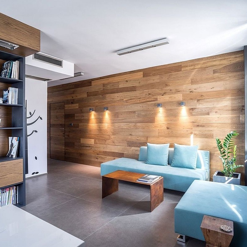 Классическое решение для пола — также удачная находка для стен. Штучный паркет — это небольшие планки из ценных пород дерева, его редко используют как тотальную отделку, чаще для декора акцентной стены за изголовьем кровати или в ТВ-зоне.