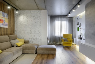 Современный дизайн гостиной, мансарда в стиле лофтБетонные и кирпичные поверхности