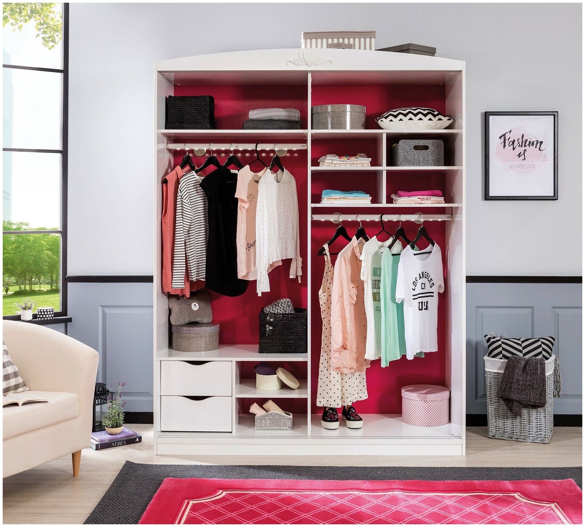 Настраиваемая гардеробная No Limit, ДСП, цена в зависимости от комплектации, комбинация с 2-дверным ящиком, 119,90 евро, 1-дверный угол, 279,99 евро, ящик, 89,99 евро, шкаф с 2 ящиками, 86 , 95 евро. Conforama.4. Выберите открытую гардеробную, чтобы украсить белую стену.