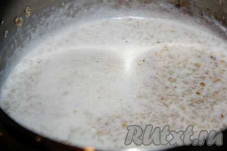 - Готовить кашу мы будем в сотейнике, в который наливаем молоко и доводим до кипения. Всыпаем овсяные хлопья, интенсивно помешивая молоко, убавляем огонь и варим кашу 4-5 минут, постоянно помешивая.