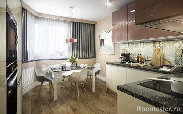 При этом следует использовать мебель, повторяющую контуры эркера. Правда, если оснастить его сплошной столешницей, то она своим ровным наружным краем сгладит эркер внутри кухни.