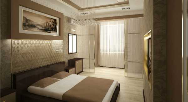 Основные акценты интерьера: бежевый и коричневый цвет, растительный рисунок обоев, орнамент сот на полупрозрачной панели изголовья кровати.