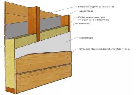 Далее пространство, ограниченное отделкой, заполняют деревянными стойками из того же бруса. Стойки должны размещаться с промежутками максимум в 50-60 см. После этого вертикальные элементы дополнительно связываются перемычками. На каждый пролет их должно быть не меньше двух. Причем, их нельзя размещать в одну линию. То есть они крепятся в разбежку.