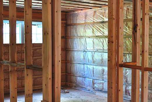 - В целях улучшения звукоизоляции, пространство каркаса плотно заполняют минеральной ватой, а в местах примыкания бруса обвязки к полу и потолку, монтируется демпфер в виде амортизирующей подложки из резины, пробки или простого рубероида.