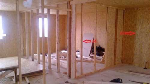 | В том месте, где будет проём двери, более широкий, чем нужен для проёма шаг, сужают за счёт установки дополнительной стойки. Высоту проёма ограничивают поперечиной. |