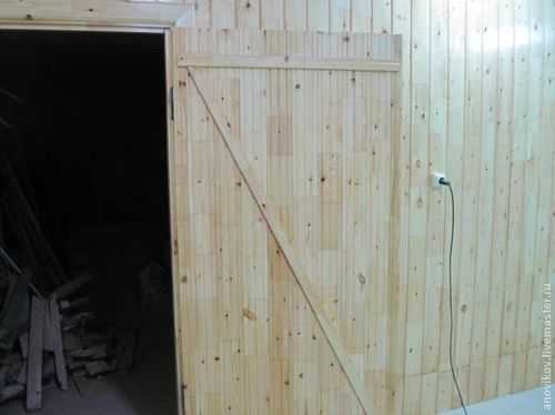 Вертикальные стойки из бруса или доски толщиной 50 мм крепят к стенам и дверным проёмам. Дощатое полотно монтируют к этим опорам.