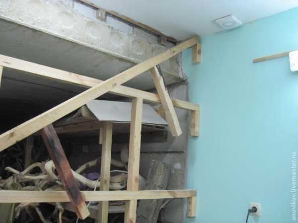 | Так как в данном случае перегородка устанавливается на мансарде, бруски для крепления стоек перегородки были предусмотрены заранее – ещё в процессе подшивки потолка. В том числе, в одном из брусьев предусмотрен вывод провода для освещения, заложенного под гипсокартонную обшивку. |