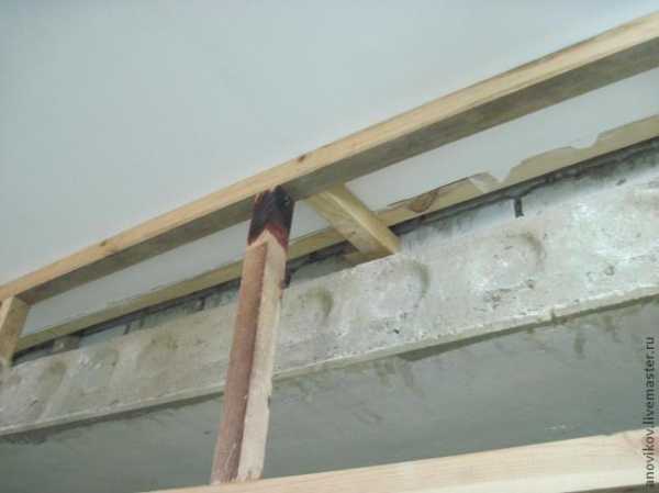 - Вначале ставят вертикальные опоры, их крепят с помощью саморезов к полу и потолку, сверяясь по отвесу. Брусья (доски) располагают на расстоянии 40-50 см друг от друга. По углам внешнего контура дополнительно создают уголки из аналогичных изделий.