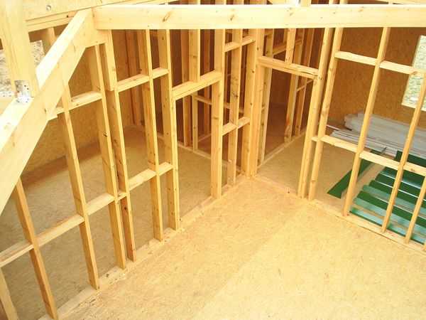При использовании в качестве обшивочного материала доски, перегородка всегда имеет каркасную конструкцию (хотя бывают и другие). Её основу собирают из брусков различного сечения, что зависит от длины пролёта, и высоты помещения, наличия проёмов, и т. д.
