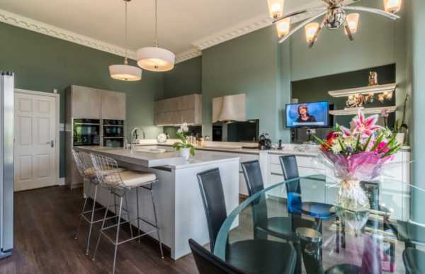 Кухня в стиле барокко с белыми плинтусами в интерьере