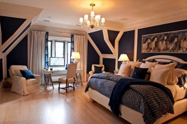 Спальня арт–деко с широкими белыми плинтусами в интерьере