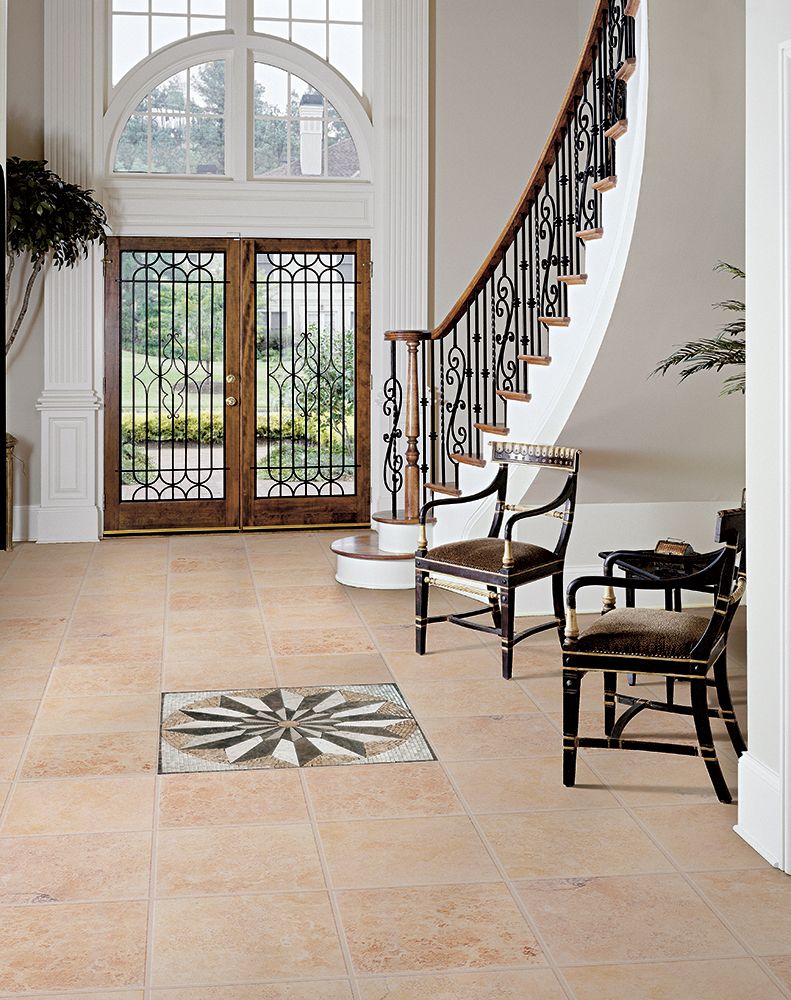 Удивите своих гостей центральным центральным элементом, который находится на полу, как только они входят.С подобным дизайном, вы можете добавить художественное присутствие, где его, скорее всего, произведет уникальное впечатление. Окружите свой фокус нейтральными плитками для еще более грандиозного входа внутрь.