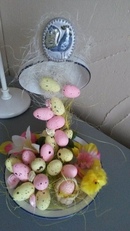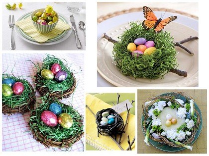 4.В середину каждого яйца поместите сваренные перепелиные яйца. Добавьте веточки вербы и цветы. (Фото 4.)
